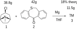 The Grignard reaction between 3-Chlorotropane, CID:21122177 (1) and Dibenzo[b,e]thiepin-11(6H)-one [1531-77-7] (2) followed by dehydration to olefin completed the synthesis of Tropatepine (3). (2)