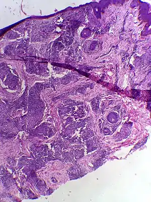Skin biopsy in tuberculoid leprosy showing multiple peri-appendageal granulomas. | |