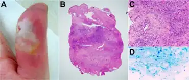 Tuberculous cellulitis-a) Erythematous swelling of thumb with erosion and maceration b) epidermal necrosis, neutrophilic infiltration in the mid dermis c) caseous necrosis surrounded by histiocytes d) Ziehl–Neelsen staining indicated acid-fast bacilli | |