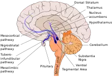 The tuberoinfundibular pathway refers to a population of dopamine neurons that project from the arcuate nucleus (a.k.a. the "infundibular nucleus") in the tuberal region of the hypothalamus to the median eminence.[1] It is one of the four major dopamine pathways in the brain. Dopamine released at this site inhibits the secretion of prolactin from anterior pituitary gland lactotrophs by binding to D2 receptors.