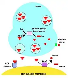 Without intervention, acetylcholine (ACh) in the peripheral nervous system activates skeletal muscles. Acetylcholine is produced in the body of the neuron by choline acetyltransferase and transported down the axon to the synaptic gap. Tubocurarine chloride acts as an antagonist for the nicotinic acetylcholine receptor (nAChr), meaning it blocks the receptor site from ACh.[16] This may be due to the quaternary amino structural motif found on both molecules.