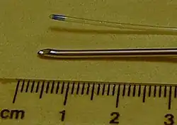 ![]() A 16G Portex Tuohy needle and epidural catheter. Large rule marks 1 cm apart. | |