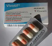 Ty21a is a live attenuated bacterial vaccine that protects against typhoid. First licensed in Europe in 1983 and in the United States in 1989, it is an orally administered, live-attenuated Ty2 strain of S. Typhi in which multiple genes, including the genes responsible for the production of Vi, have been deleted so as to render it harmless but nevertheless immunogenic. It is one of the three typhoid vaccines currently recommended by the World Health Organization (the other two being the Typhoid Conjugate Vaccine (TCV) and Vi capsular polysaccharide vaccine).[1]