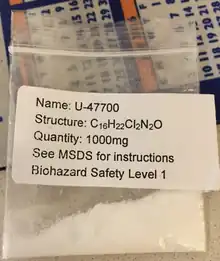 - ↑ Schneir A, Metushi IG, Sloane C, Benaron DJ, Fitzgerald RL (January 2017). "Near death from a novel synthetic opioid labeled U-47700: emergence of a new opioid class". Clinical Toxicology. 55 (1): 51–54. doi:10.1080/15563650.2016.1209764. PMID 27448790. S2CID 25206275.
