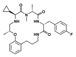 Ulimorelin (INN, USAN) (developmental code name TZP-101) is a drug with a modified cyclic peptide structure which acts as a selective agonist of the ghrelin/growth hormone secretagogue receptor (GHSR-1a).[1] Unlike many related drugs, ulimorelin has little or no effect on growth hormone (GH) release in rats.[2] However, like ghrelin and other ghrelin agonists, ulimorelin does stimulate GH release with concomitant increases in insulin-like growth factor 1 (IGF-1) in humans.[3] It has been researched for enhancing gastrointestinal motility, especially in gastroparesis[4] and in aiding recovery of bowel function following gastrointestinal surgery, where opioid analgesic drugs used for post-operative pain relief may worsen existing constipation.[5][6][7][8] While ulimorelin has been shown to increase both upper and lower gastrointestinal motility in rats,[8] and showed promising results initially in humans,[4][6] it failed in pivotal clinical trials in post operative ileus.[7]