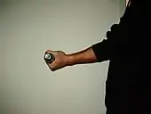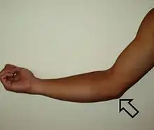 Gridiron football, racquet sports, ice hockey and water polo players have also been treated for damage to the UCL.[5][6] Specific overhead movements like those that occur during baseball pitching, tennis serving or volleyball spiking increase the risk of UCL injury.[7] During the cocking phase of pitching, the shoulder is horizontally abducted, externally rotated and the elbow is flexed. There is slight stress on the UCL in this position but it increases when the shoulder is further externally rotated in a throw. The greater the stress the more the UCL is stretched causing strain. During the overhead throwing motion, valgus stress on the medial elbow occurs during arm cocking and acceleration. The initiation of valgus stress occurs at the conclusion of the arm-cocking phase. In the transitional moment from arm cocking to arm acceleration, the shoulder vigorously rotates internally, the forearm is in near full supination, and the elbow flexes from 90° to approximately 125°. From late cocking to ball release, the elbow rapidly extends from approximately 125° to 25° at ball release.[8] This causes extreme valgus stress and tensile strain on the UCL.
