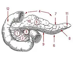 ![]() 1: Head of pancreas 2: Uncinate process of pancreas 3: Pancreatic notch 4: Body of pancreas 5: Anterior surface of pancreas 6: Inferior surface of pancreas 7: Superior margin of pancreas 8: Anterior margin of pancreas 9: Inferior margin of pancreas 10: Omental tuber 11: Tail of pancreas 12: Duodenum | |
