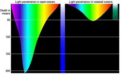 Water attenuates light due to absorption[2] and as light passes through water colour is selectively absorbed by the water. Color absorption is also affected by turbidity of the water and dissolved material. Water preferentially absorbs red light, and to a lesser extent, yellow, green and violet light, so the color that is least absorbed by water is blue light.[3] Particulates and dissolved materials may absorb different frequencies, and this will affect the color at depth, with results such as the typically green color in many coastal waters, and the dark red-brown color of many freshwater rivers and lakes due to dissolved organic matter.[1]