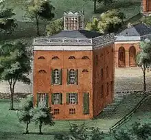 Just weeks before Dunglison and his wife arrived in the United States, Jefferson had written to Joseph C. Cabell that an anatomical theater would be "indispensable to the school of anatomy," and that "there cannot be a single dissection until a proper theater is prepared giving an advantageous view of the operation to those within, and effectually excluding observation from without."[3] This structure, which was eventually demolished in 1938, was one of the first of its kind in the entire United States, conceived and blueprinted by Jefferson himself, who pushed fervently for its construction up until the time of his death in 1825.