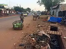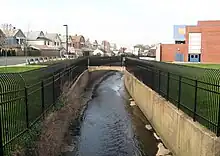 Urban runoff is surface runoff of rainwater, landscape irrigation, and car washing[1] created by urbanization. Impervious surfaces (roads, parking lots and sidewalks) are constructed during land development. During rain, storms, and other precipitation events, these surfaces (built from materials such as asphalt and concrete), along with rooftops, carry polluted stormwater to storm drains, instead of allowing the water to percolate through soil.[2] This causes lowering of the water table (because groundwater recharge is lessened) and flooding since the amount of water that remains on the surface is greater.[3][4] Most municipal storm sewer systems discharge untreated stormwater to streams, rivers, and bays. This excess water can also make its way into people's properties through basement backups and seepage through building wall and floors.