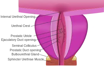 In males, the urethral crest is known as the crista urethralis masculinae, or the crista phallica, and is a longitudinal fold on the posterior wall of the urethra extending from the uvula of the bladder through the prostatic urethra.[1] It is from 15 to 17 mm. in length, and about 3 mm. in height, and contains muscular and erectile tissue. When distended, it may serve to prevent the passage of the semen backward into the bladder.[2]