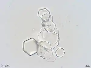 The presence of crystals in the urine has conventionally been associated with the formation of kidney stones, and crystalluria is more common in people with kidney stones than those without. However, crystalluria occurs in up to 20% of the normal population, so it is not a reliable diagnostic marker.[127] Some types of crystals are characteristically associated with disease states. Leucine and tyrosine crystals may be observed in liver disease,[24] and cystine crystals indicate cystinuria (although they look identical to hexagonal variants of uric acid crystals, and can only be distinguished with further testing).[128] Cholesterol crystals may rarely be seen in nephrotic syndrome and chyluria.[129]