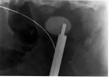 Where a CT scan is unavailable, an intravenous pyelogram may be performed to help confirm the diagnosis of urolithiasis. This involves intravenous injection of a contrast agent followed by a KUB film. Uroliths present in the kidneys, ureters, or bladder may be better defined by the use of this contrast agent. Stones can also be detected by a retrograde pyelogram, where a similar contrast agent is injected directly into the distal ostium of the ureter (where the ureter terminates as it enters the bladder).[51]