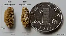 A color photograph of a kidney stone, 8 millimetres in length.
