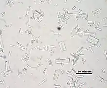 Struvite stones (triple-phosphate/magnesium ammonium phosphate) have a 'coffin lid' morphology by microscopy.[63]