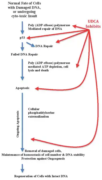 UDCA interferes with DNA repair and with apoptosis of DNA damaged cells with resultant mutagenic, and anti-proliferative properties[28]