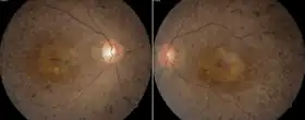The progressive blindness of Usher syndrome results from retinitis pigmentosa.[11][12] The photoreceptor cells usually start to degenerate from the outer periphery to the center of the retina, including the macula. The degeneration is usually first noticed as night blindness (nyctalopia); peripheral vision is gradually lost, restricting the visual field (tunnel vision), which generally progresses to complete blindness. The qualifier pigmentosa reflects the fact that clumps of pigment may be visible by an ophthalmoscope in advanced stages of degeneration.[13]
