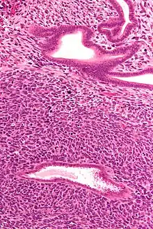 Micrograph of a uterine adenosarcoma showing a mitotically active malignant stroma and benign glands. H&E stain. | |