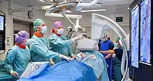 Uterine artery embolization is a procedure in which an interventional radiologist uses a catheter to deliver small particles that block the blood supply to the uterine body. The procedure is primarily done for the treatment of uterine fibroids and adenomyosis.[1][2] Since uterine fibroids are the most common indication, it is also often referred to as uterine fibroid embolization. Compared to surgical treatment for fibroids such as a hysterectomy, in which a woman's uterus is removed, uterine artery embolization may be beneficial in women who wish to retain their uterus. Other reasons for uterine artery embolization are postpartum hemorrhage and uterine arteriovenous malformations.[3]