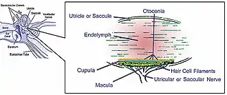 ![]() illustration of otolith organs showing detail of utricle, otoconia, endolymph, cupula, macula, hair cell filaments, and saccular nerve | |