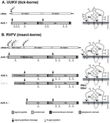 Phleboviruses are viruses with a negative-sense RNA genome consisting of three segments. The small segment (S) codes for the viral N protein and a non structural protein, NSs via an ambisense coding strategy. The medium-sized segment (M) codes for a precursor of the viral glycoproteins and non-structural components. The product of the largest segment (L) is the viral RNA-dependent RNA polymerase.[4]