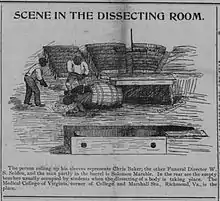 From its beginning, the Medical College of Richmond, Virginia, boasted of its unique ability to acquire medical cadavers in abundance. It was routinely stated in their advertisements.[34][35][36] As such was the case in the May 11, 1838 edition of the Richmond Enquirer, which stated: "In no city in our Union are anatomical materials so abundant and easily procured as Richmond..."[37] What was not stated was that the anatomical material was acquired through participation in the illegal cadaver trade, through grave robbing. There were many persons involved in the practice of grave robbing for the medical college, including various hired resurrectionists, medical students, the demonstrator of anatomy, as well as the professor of anatomy.[38][39][40][41][42][43][44][45]