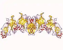 - 1 2 Dessen A, Volchkov V, Dolnik O, Klenk HD, Weissenhorn W (August 2000). "Crystal structure of the matrix protein VP40 from Ebola virus". EMBO J. 19 (16): 4228–36. doi:10.1093/emboj/19.16.4228. PMC 302032. PMID 10944105.