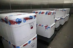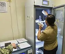 Vaccine storage relates to the proper vaccine storage and handling practices from their manufacture to the administration in people.[1] The general standard is the 2–8 °C cold chain for vaccine storage and transportation. This is used for all current US Food and Drug Administration (FDA)-licensed human vaccines and in low and middle-income countries. Exceptions include some vaccines for smallpox, chickenpox, shingles and one of the measles, mumps, and rubella II vaccines, which are transported between −25 °C and −15 °C.[2][3] Some vaccines, such as the COVID-19 vaccine, require a cooler temperature between −80 °C and −60 °C for storage.[3]