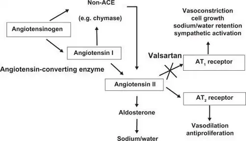 Valsartan blocks the actions of angiotensin II, which include constricting blood vessels and activating aldosterone, to reduce blood pressure.[22] The drug binds to angiotensin type I receptors (AT1), working as an antagonist. This mechanism of action is different than that of the ACE inhibitor drugs, which block the conversion of angiotensin I to angiotensin II. As valsartan acts at the receptor, it can provide more complete angiotensin II antagonism since angiotensin II is generated by other enzymes as well as ACE. Also, valsartan does not affect the metabolism of bradykinin like ACE inhibitors do.[22]