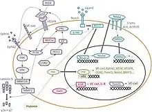 In order for new vasculature to form through VM, several requirements must be met. These generally include aberrant expression of VE-cadherin, as well as changes to the density and composition of the extracellular matrix.[6] VE-cadherin is a transmembrane protein that is specifically expressed in endothelial cells to promote and maintain specific adhesion of endothelial cells critical to vascularization. However, aggressive and metastatic cancers have been found to have aberrant expression of VE-cadherin, allowing for formation of cancer cell specific vasculature.[7] VE-cadherin also regulates inter-cellular signaling pathways which promote invasion of cancer cells into nearby and distal tissues, a major component of metastatic disease.[7] VE-cadherin has also been linked to regulatory functions in cell proliferation, cell death, and the expression and function of VEGFRs.[8]