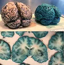 Gross pathology of a normal brain and a brain of a patient treated with methylene blue before death.