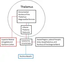 The amygdala connects to the thalamus both through the amygdalofugal pathway and through a direct connection to the dorsomedial nucleus of the thalamus.[13] After leaving the substantia innominata, the ventral amygdalofugal pathway continues on a medial path to enter the septal region, the lateral preoptic area, the hypothalamus, and the nucleus of the diagonal band. The fibers which bypass the preoptic area and the hypothalamus travel more superiorly and enter the inferior thalamic peduncle. From there, the amygdalofugal fibers travel just laterally to the mammillothalamic tract in the ventral anterior nucleus as they enter the dorsal medial nucleus.