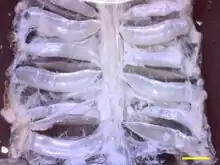 An adult's trachea has an inner diameter of about 1.5 to 2 centimetres (12 to 34 in) and a length of about 10 to 11 cm (4 to 4+14 in), wider in males than females.[2] The trachea begins at the lower edge of the cricoid cartilage of the larynx[3] at the level of sixth cervical vertebra (C6)[2] and ends at the carina, the point where the trachea branches into left and right main bronchi.[2], at the level of the fourth thoracic vertebra (T4),[2] although its position may change with breathing.[3] The trachea is surrounded by 16–20 rings of hyaline cartilage; these 'rings' are 4 millimetres high in the adult, incomplete and C-shaped.[2] Ligaments connect the rings.[3] The trachealis muscle connects the ends of the incomplete rings and runs along the back wall of the trachea.[3] Also adventitia, which is the outermost layer of connective tissue that surrounds the hyaline cartilage, contributes to the trachea's ability to bend and stretch with movement.[4]