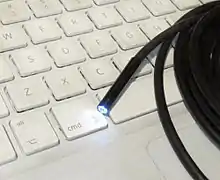 A flexible Videoscope or Video Borescope is an advanced type of borescope that houses a very small image sensor embedded into the tip of the scope. The video image is relayed from the distal tip and focusable lens assembly back to the display via internal wiring. This is unlike a traditional rigid borescope and flexible fiberscope. Rigid borescopes use hard optical relay components to transfer the image from the tip to an eyepiece and flexible fiberscopes use coherent image fiber optics to relay the image to one's eye through an eyepiece. The image quality of a videoscope is superior to that of a fiberscope and can be compared to that of an intermediate camcorder.