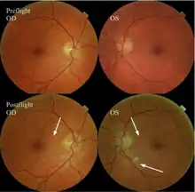 - Kinyoun, JL; Chittum, ME; Wells, CG (15 May 1988). "Photocoagulation treatment of radiation retinopathy". American Journal of Ophthalmology. 105 (5): 470–8. doi:10.1016/0002-9394(88)90237-1. PMID 3369516.