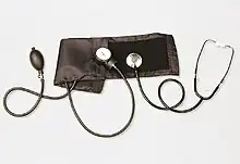 Manual sphygmomanometer and stethoscope used to take blood pressure in clinic.