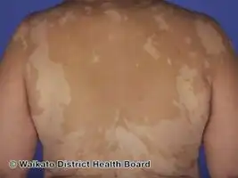 The convalescent phase is characterized by gradual tissue depigmentation of skin with vitiligo and poliosis, sometimes with nummular depigmented scars, as well as alopecia and diffuse fundus depigmentation resulting in a classic orange-red discoloration ("sunset glow fundus"[5][8][7]) and retinal pigment epithelium clumping and/or migration.[2][6]