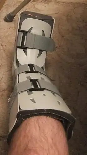 ![]() A walking boot being used to aid weight bearing after an ankle fracture. |