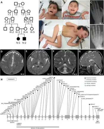 a) Pedigree b) children illustrating severe dystrophy, microcephaly, and distal contractures c)severe osteopenia on conventional X-rays d-g) parietal pachygyria h)mutations in the RAB3GAP1 gene in people with WARBM1 | |