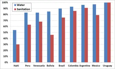 Water supply and sanitation in Latin America is characterized by insufficient access and in many cases by poor service quality, with detrimental impacts on public health.[1] Water and sanitation services are provided by a vast array of mostly local service providers under an often fragmented policy and regulatory framework. Financing of water and sanitation remains a serious challenge.