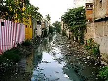 Sewage discharged from cities, towns and some villages is the predominant cause of water pollution in India.[1] Investment is needed to bridge the gap between the sewage India generates and its treatment capacity of sewage per day.[4] Major cities of India produce 38,354 million litres per day (MLD) of sewage, but the urban sewage treatment capacity is only 11,786 MLD.[7] A large number of Indian rivers are severely polluted as a result of discharge of domestic sewage.
