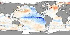 Sea surface skin temperature anomalies in November 2007 showing La Niña conditions