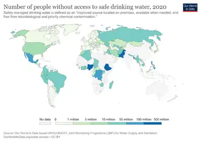 With abundant water resources, Bangladesh faces various water contaminations mainly caused by pollutants, bacteria, and pesticides.[11] Historically, water sources in Bangladesh came from surface water contaminated with bacteria. Drinking infected water resulted in infants and children suffering from acute gastrointestinal disease that led to a high mortality rate.[12] According to UNICEF, 38.3% of Bangladeshis drink unsafe water from bacteria-contaminated sources.[13] Bangladesh is facing an acute reliable drinking water scarcity. Bangladesh's surface and ground water are highly saline due to rising sea levels.[14]