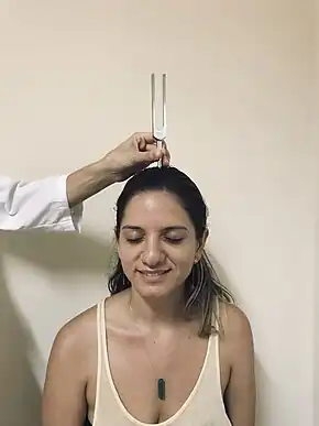 The Weber test is a hearing test that uses a tuning fork to assess hearing loss in one ear.[1] It requires placing a vibrating tuning fork on the top of the head and asking whether the sound is heard more loudly in the left or right ear or in the middle.[1] It is typically used alongside the Rinne test to distinguish between conductive and sensorineural hearing loss, in which the Weber test demonstrates a louder sound in the better ear.[1]