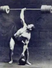 Arthur Saxon performing a Two Hands Anyhow with an early kettlebell and plate-loaded barbell