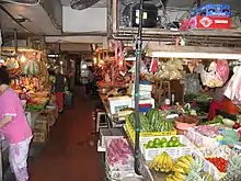 Large centralised wet markets have existed in Hong Kong since at least 16 May 1842, when Central Market was opened.[111] Wet markets are most frequented by older residents, those with lower incomes, and domestic helpers who serve approximately 10 percent of Hong Kong's residents.[112] Most neighbourhoods contain at least one wet market.[20] Wet markets have become destinations for tourists to "see the real Hong Kong".[113]