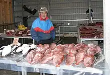 In Greenland, local wet markets known as brætter sell food from wild animals, including seal meat, whale meat, reindeer meat, and polar bear meat.[98] Brætter do not sell live animals, but most meat sold in brætter is fresh and recently butchered.[98] While larger towns have purpose-built facilities, the brætter in smaller towns and village settlements sell seafood in open-air stands without running water or electricity.[99] Only fresh meat was allowed to be sold in Nuuk at Kalaaliaraq Market, the largest fresh food market in Greenland, until 2018 when the government of Greenland began permitting the sale of dried and salted meat at Kalaaliaraq.[98]