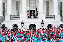 Hours after the ceremony, Trump tested positive for COVID-19, although the public would not learn of this result until one year later, in October 2021.[8] Trump himself may have been infectious at that point, but he and his entourage attended several subsequent events unmasked, including the first presidential debate against Joe Biden in Cleveland, Ohio on September 29.[9] The next day, Presidential Counselor Hope Hicks was placed in quarantine aboard Air Force One while returning with Trump from a campaign event in Minnesota. Following that, the president proceeded on schedule to an October 1 New Jersey fundraiser where he mingled, unmasked, with donors.[10] More infections were reported in late October among Vice President Mike Pence's staff,[11] and a second large outbreak occurred after Election Day, after Trump held a watch party in the East Room.[12]