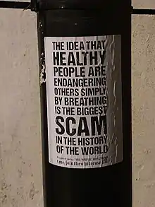 The White Rose is a group that runs a stickering campaign to distribute disinformation and conspiracy theories about the COVID-19 pandemic.[1] Its name is an appropriation of that of the anti-Nazi White Rose group, to which it is unrelated.[2] Stickers distributed by the group include anti-vaccine and anti-mask messages, denials that the COVID-19 pandemic exists, and conspiracy theories about a New World Order.[3][4] Their tactics have been compared to those of the anti-immigration Hundred-Handers group.[5]