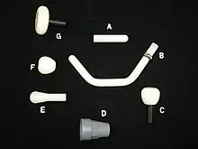 A variety of cane tips. A = Pencil Tip, B = Bundu Basher Tip, C = Ball Race Overfit Tip, D = Rubber Support Cane Tip, E = Pear Tip, F = Rural Tip, G = Jumbo Roller Tip